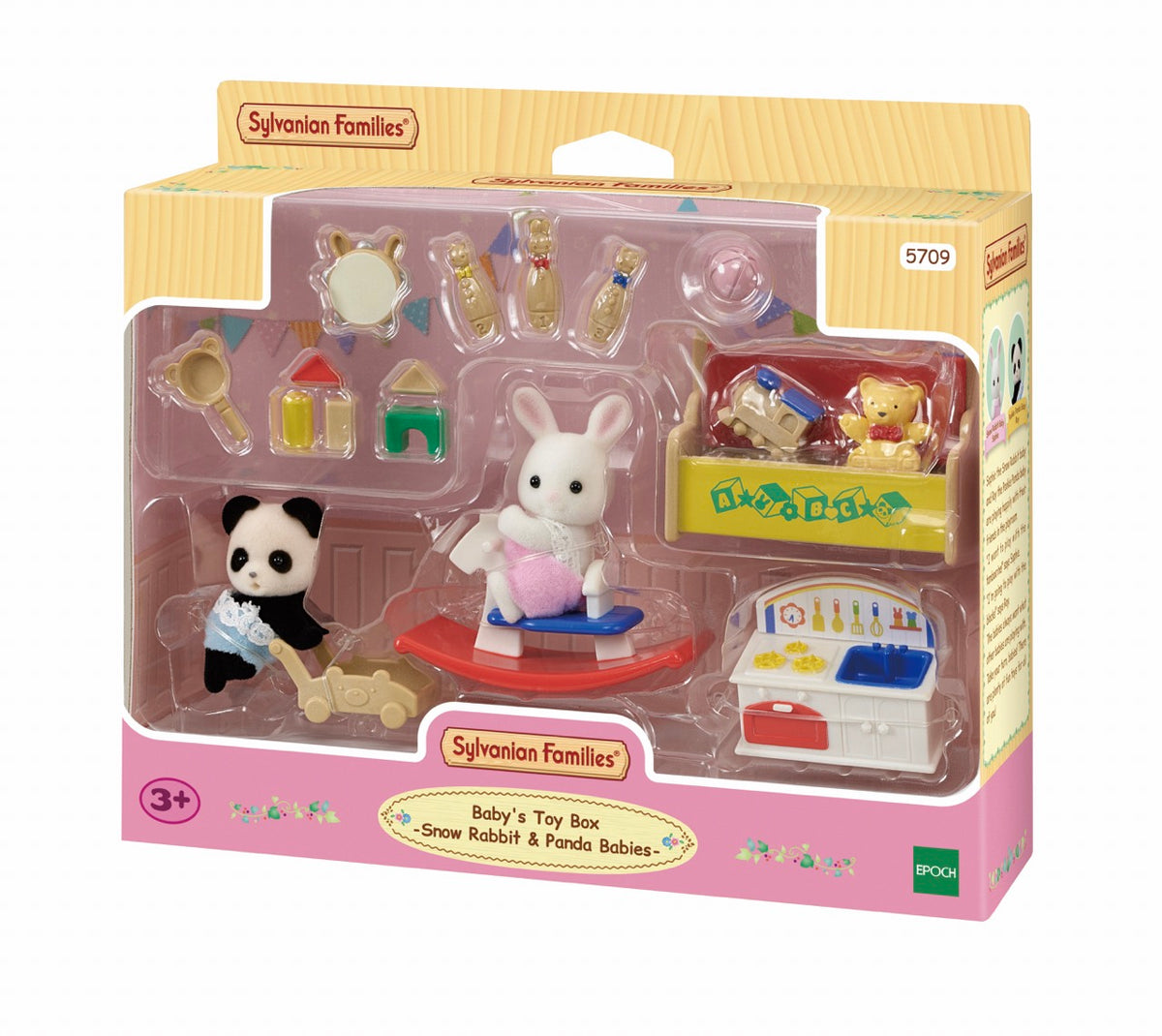 Ta barvit komplet vključuje dve figurici, odprto škatlo za igrače, otroško kuhinjo, gugalnico in številne dodatne igrače za igro.