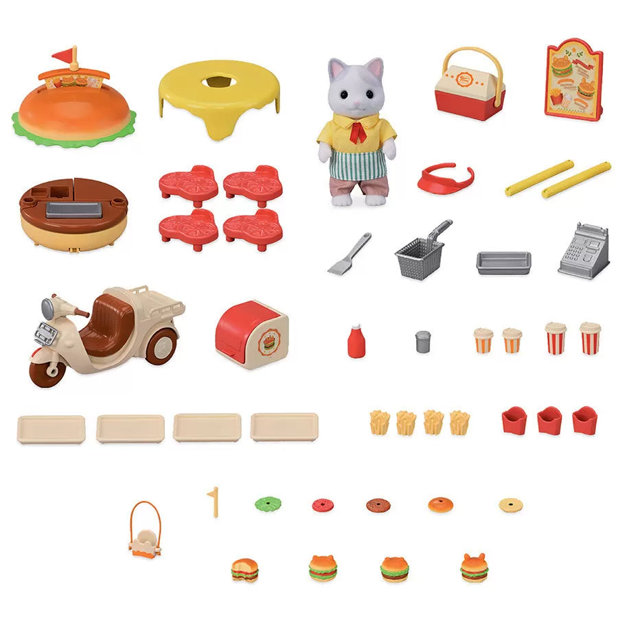 Cena za jednostkę ZaZestaw Stoisko z hamburgerami zawiera stoisko z hamburgerami w kształcie hamburgera, rower dostawczy oraz tatę Latte Cat.