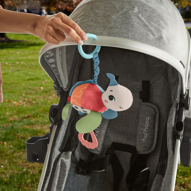 Zainspirowana zwierzętami promowanymi przez Światowy Fundusz na rzecz Przyrody, pluszowa zabawka Fisher-Price Planet Friends Sea Me Bounce Turtle do wózka wykonana jest z tkaniny zawierającej 80% plastiku z recyklingu i zapakowana w opakowanie z certyfikatem FSC, wspierające odpowiedzialne leśnictwo. Zabawka zawiera różnorodne elementy dotykowe i wizualne dla atrakcyjnej sensorycznej zabawy oraz uchwyt do ciągnięcia i zwalniania, który aktywuje zabawne dzwoniące dźwięki i podskakiwanie. Uchwyt służy również jako gryzak w kształcie muszli, wolny od BPA. Zabawka łatwo mocuje się do budki wózka, maty edukacyjnej lub torby na pieluchy, co umożliwia korzystanie z niej w podróży.