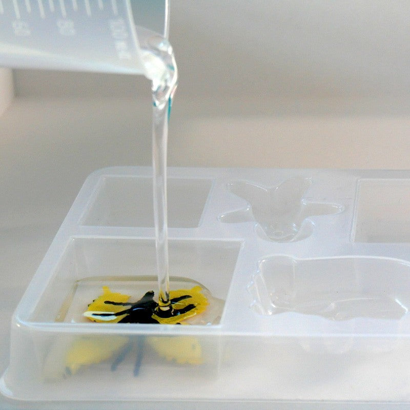Ta działalność do samodzielnego wykonania jest idealna dla wszystkich, którzy chcą uwiecznić piękne wspomnienia! Suche liście, muszle, a nawet plastikowe zwierzęta mogą stać się wspaniałymi ozdobami dzięki temu zestawowi żywicy. Dzieci również będą cieszyć się tą prostą aktywnością, tworząc sztuczne diamenty, podkładki i inne dekoracje do swojego pokoju! Po przygotowaniu bazy z żywicy dzieci będą mogły pomalować przygotowaną masę i wlać ją do różnych form, zanim dodadzą dekoracyjne elementy. Po 24 godzinach, gdy wyschnie, piękne przezroczyste dekoracje można wyjąć z form.