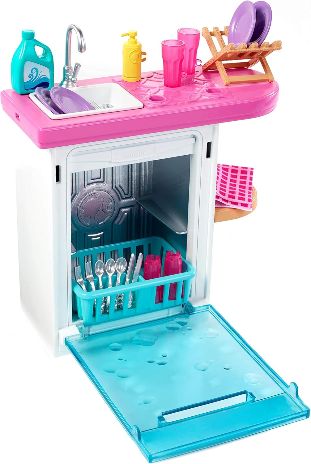 Dajcie upust wyobraźni z zestawem mebli Barbie, który sprawi, że czas zabawy będzie jeszcze przyjemniejszy! Z przezroczystymi drzwiami, które można otwierać i zamykać, oraz koszykiem, który można wysuwać i chować, zestaw zmywarki zamienia zwykłe zadanie w zabawną przygodę. Duża ilość naczyń oznacza wiele historii – ustawiaj i zdejmuj talerze, filiżanki i sztućce raz za razem. Dostępne są również dodatkowe akcesoria, takie jak butelka detergentu do mycia, ściereczka do mycia i ściereczka do suszenia, które dzieci mogą używać podczas zabawy.