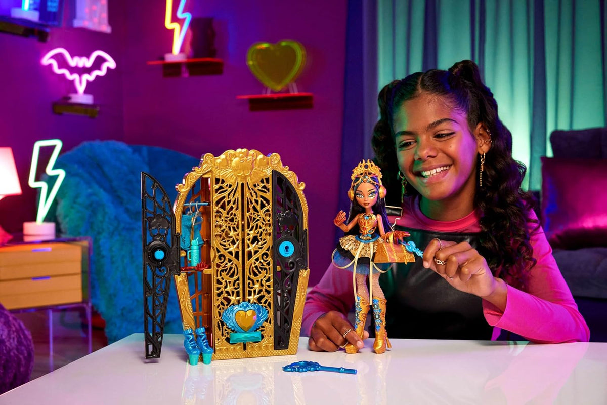 Cena za jednostkę ZaOdblokuj tajemnice za drzwiami Monster High z zestawem Skulltimate Secrets: Monster Mysteries szafy! Zawiera lalkę Cleo De Nile oraz eleganckie ubrania i dodatki. Cleo De Nile musi wystąpić na pokazie, ale zniknęła! Szukaj wskazówek, aby odkryć, gdzie się znajduje, z ponad 19 niespodziankami w trzech strasznie zabawnych krokach: rozwiąż, odblokuj i odkryj.