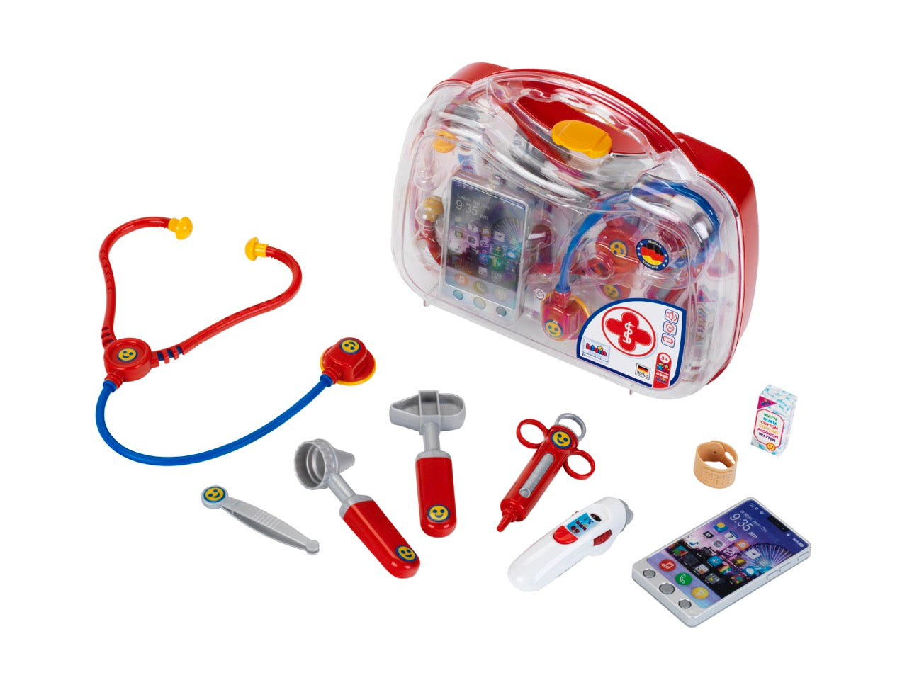 Polski Nowoczesna lekarska walizka to idealne wyposażenie dla wszystkich, którzy lubią ratować pluszowe zwierzęta i udzielać pierwszej pomocy. Z termometrem klinicznym, stetoskopem, strzykawką, lusterkiem do ucha i młoteczkiem neurologicznym chore lalki i pluszaki są dokładnie badane w mgnieniu oka i szybko wracają do zdrowia. Elektryczny monitor tętna jest szczególnie przydatny w diagnostyce. Jeśli coś pójdzie nie tak, pomoc można szybko wezwać za pomocą smartfona. Po dziesięcioleciach doświadczeń Theo Klein optymalnie dostosował walizki i instrumenty do dziecięcych rączek, z zaokrąglonymi krawędziami i wygodnym uchwytem. Solidna i wykonana z wysokiej jakości plastiku. Idealna do kreatywnych zabaw, które przy okazji ćwiczą zdolności motoryczne.