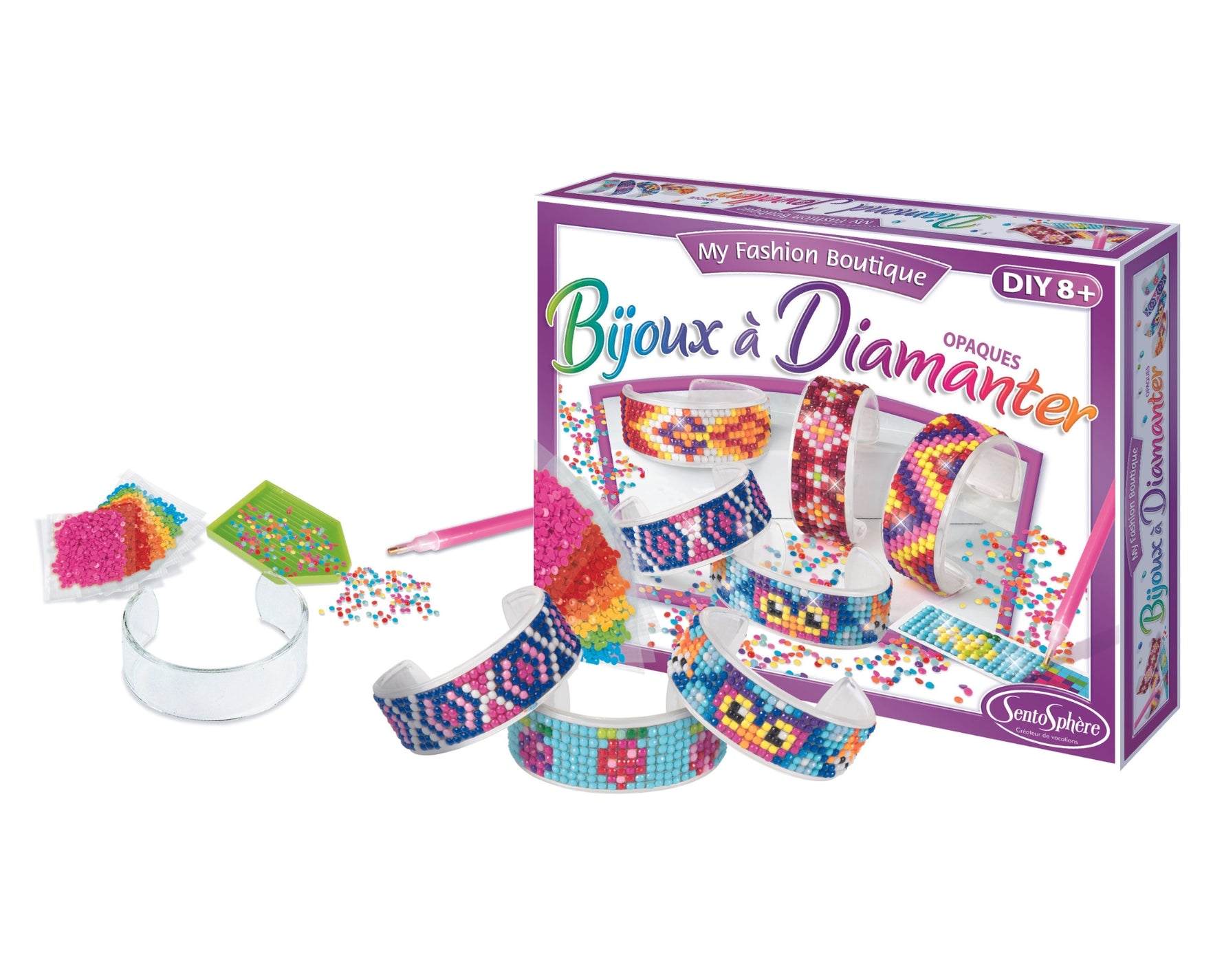 Stwórz 6 bransoletek z geometrycznymi i kolorowymi wzorami! Są łatwe do wykonania i noszenia, a także idealne na prezenty. Każdy kwadratowy, nieprzezroczysty diament podnosisz za pomocą klejącego pióra i umieszczasz na klejącym płótnie według wzorów. Po zakończeniu nałóż trochę lakieru na wierzch, aby wszystko się trzymało, a swoją piękną kreację przymocuj do jednej z 6 dołączonych akrylowych podstawek. Świetna zabawa dla młodych miłośniczek mody i mam!