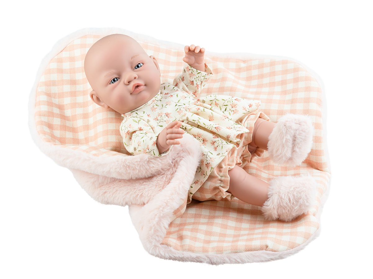 - Materiał, z którego jest wykonana, ma miększy dotyk i zapach, aby bardziej przypominać niemowlę. Ubrana jest w kwiecistą sukienkę i puszyste majteczki. Dołączony jest również jej kraciasty i puszysty kocyk.