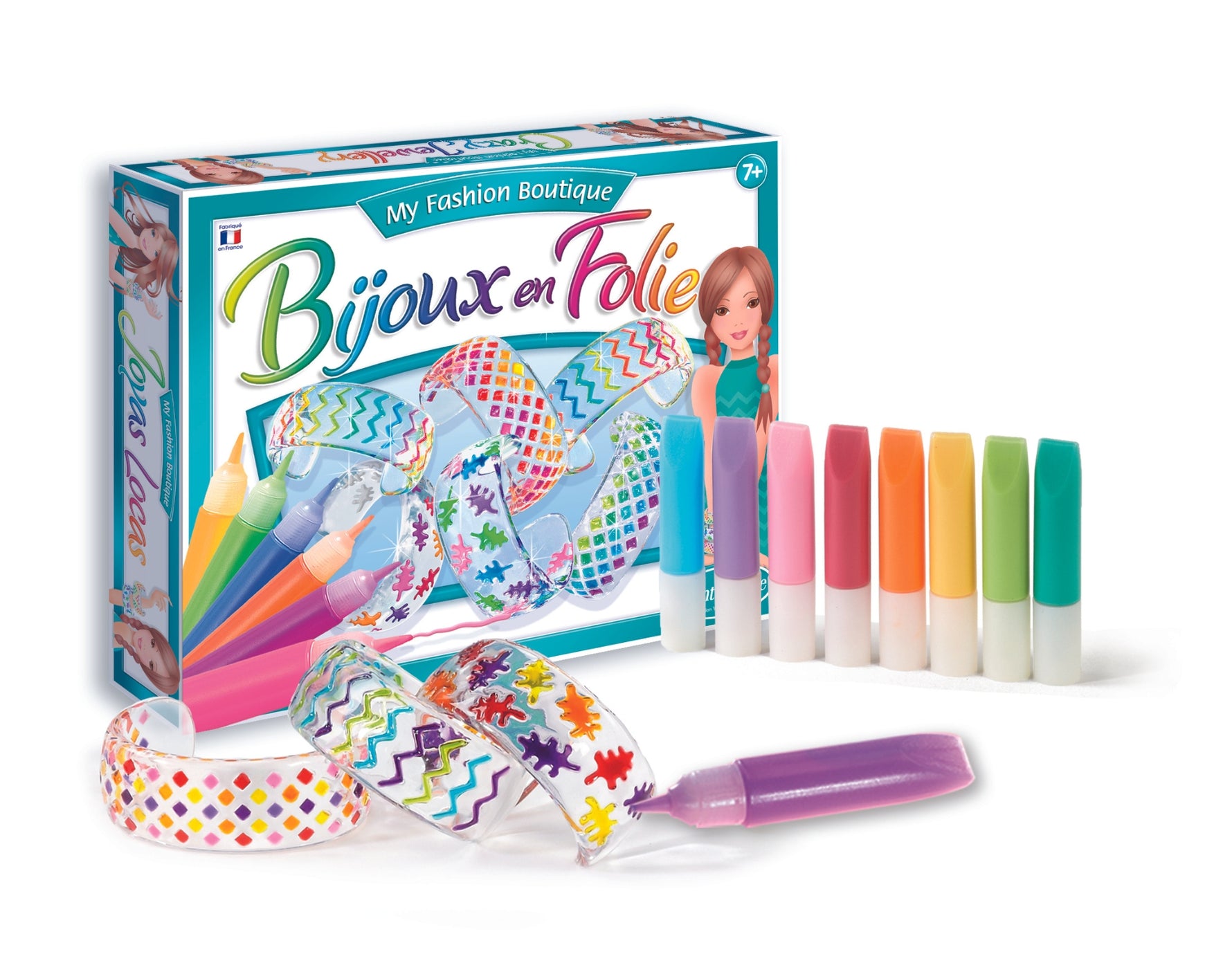 Ta komplet zawiera 3 przezroczyste bransoletki, które można malować i ponownie malować wzorami za pomocą 10 błyszczących kolorów. Warstwę farby można usunąć za pomocą ostrego narzędzia, aby umożliwić nałożenie nowych kolorów.