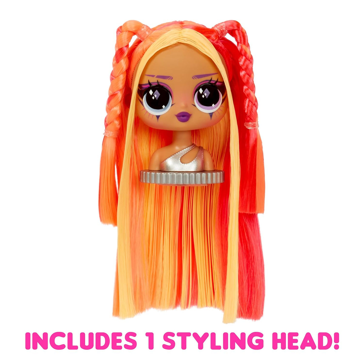 Spremenite Baileyin videz v trenutku, tako da zamenjate njene modro, vijolično in roza lase z neon magenta in oranžnim stiliziranim glavkom, ki ga enostavno pritrdite na telo punčke.
