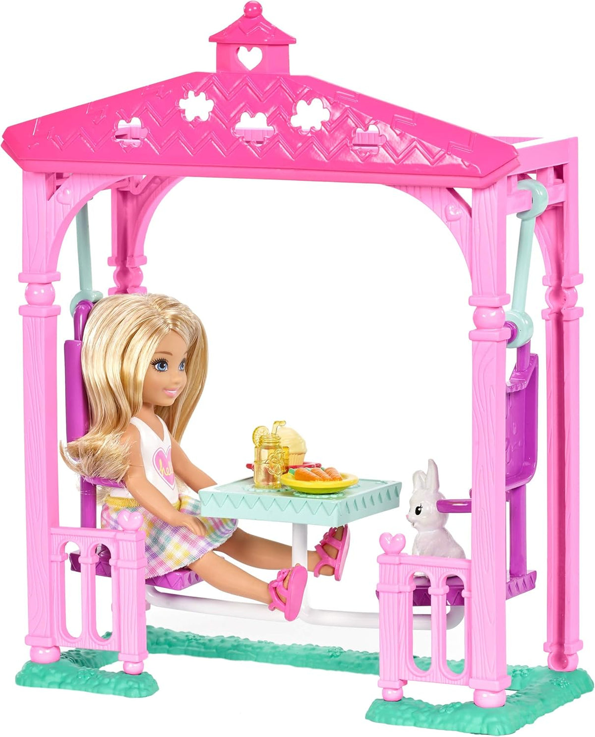 Lalka Chelsea i jej uroczy króliczek mogą cieszyć się stylem huśtawki w tym pawilonie piknikowym przyjaznym dla zwierząt domowych. Ma stół i dwa krzesła, które służą również jako huśtawki – wystarczy pchnąć, aby rozpocząć zabawę!