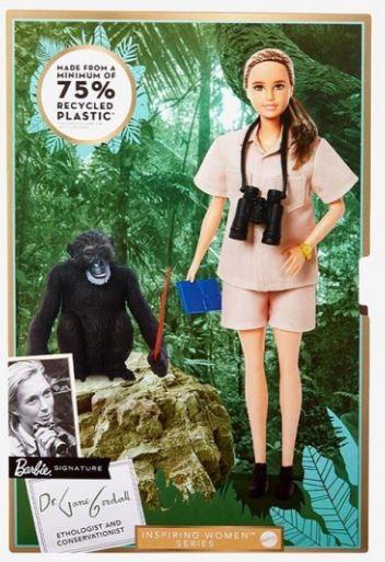 Cena za jednostkę ZaSeria Barbie Inspiring Women oddaje hołd niesamowitym bohaterkom swoich czasów: odważnym kobietom, które ryzykowały, zmieniały zasady i torowały drogę pokoleniom dziewcząt, by marzyły o jeszcze większych marzeniach. Na cześć dziesięcioleci poświęcenia, przełomowych badań i heroicznych osiągnięć jako działaczka na rzecz środowiska, ekspertka od zachowań zwierząt i aktywistka, Barbie dedykuje specjalną kolekcjonerską lalkę dr Jane Goodall, DBE, założycielce Instytutu Jane Goodall i Ambasadorce Pokoju ONZ. Lalka wykonana jest z recyklingowanego plastiku. Razem z małpką David Greybeard, lalka Barbie dr Jane Goodall nosi strój terenowy i jest wyposażona w lornetkę oraz notes.