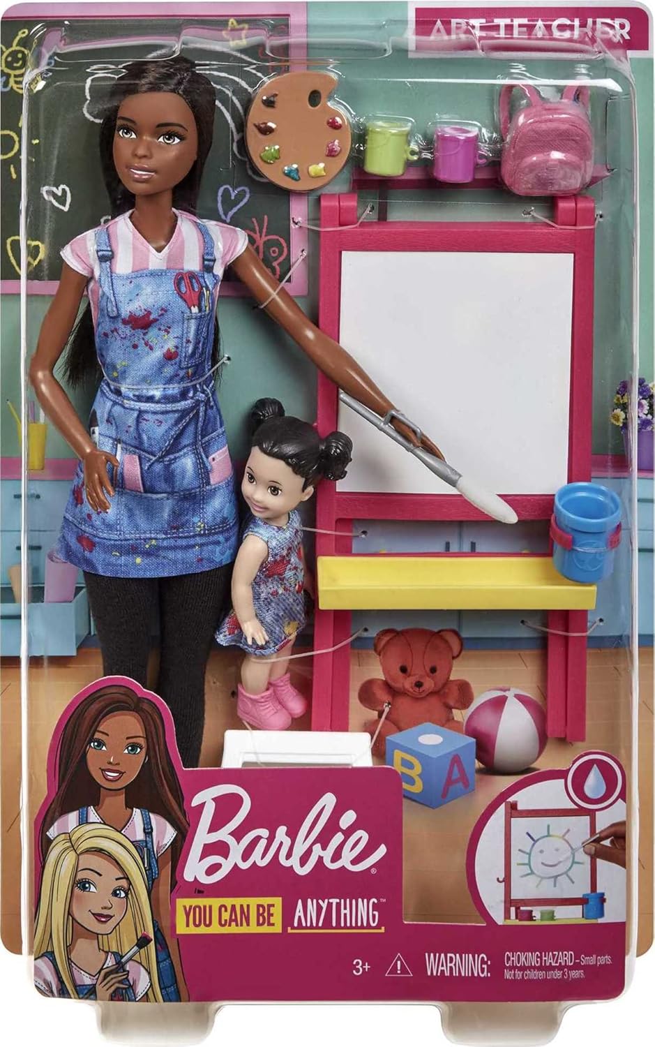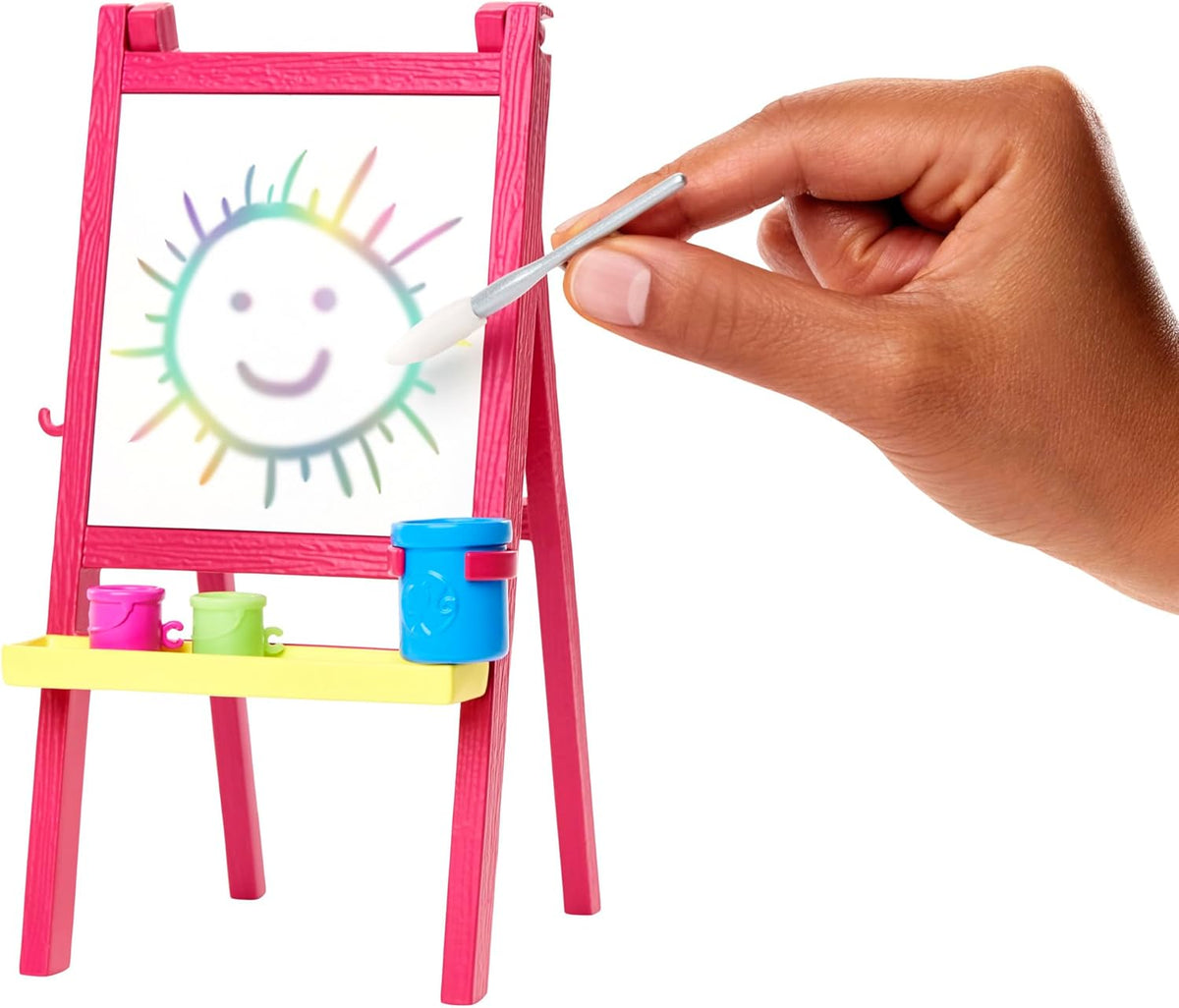 Barbie nauczycielka sztuki pokazuje swojej uczennicy, jak malować na sztaludze z niespodzianką zmieniającą kolory: zanurz pędzel (w zestawie) w wodzie, pomaluj pustą powierzchnię, a obraz magicznie się pojawi! Twórz na nowo, wycierając powierzchnię. Barbie ubrana jest w legginsy, koszulkę, tenisówki i uroczy dżinsowy fartuszek, gotowa uczyć swoją ciekawską uczennicę, która ma na sobie śliczną sukienkę i plecak. Zabawki do zabawy obejmują sztalugę z powierzchnią do malowania, pojemniki na farbę i wodę, paletę, pędzel oraz stołek dla uczennicy.