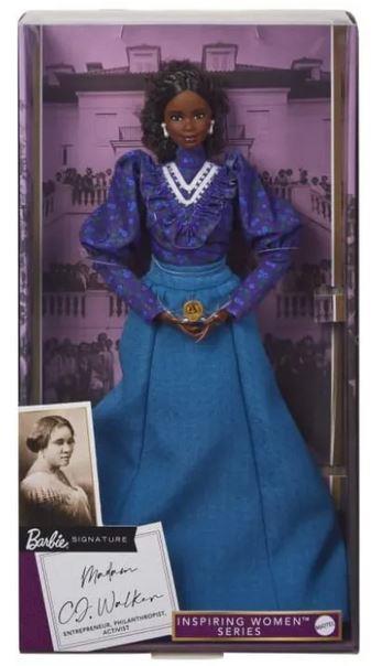 Seria Barbie Inspiring Women oddaje hołd niesamowitym bohaterkom swoich czasów: odważnym kobietom, które ryzykowały, zmieniały zasady i torowały drogę pokoleniom dziewcząt, by marzyły więcej niż kiedykolwiek wcześniej. Madam C. J. Walker, urodzona jako Sarah Breedlove w 1867 roku na plantacji bawełny w Delcie w Luizjanie, była córką rodziców, którzy wcześniej byli niewolnikami, a potem zostali dzierżawcami ziemi. Walker stała się odnoszącą sukcesy przedsiębiorczynią i pierwszą udokumentowaną samotną milionerką w USA. Barbie oddaje hołd jej niezłomnej determinacji za pomocą kolekcjonerskiej lalki zaprojektowanej na jej podobieństwo. Lalka zawiera również dodatek „Madam C.J. Walker's Wonderful Hair Grower”. Lalka Barbie Madam C.J. Walker będzie wspaniałym dodatkiem do każdej kolekcji. W zestawie znajduje się stojak na lalkę oraz Certyfikat Autentyczności. Lalka nie może stać samodzielnie.