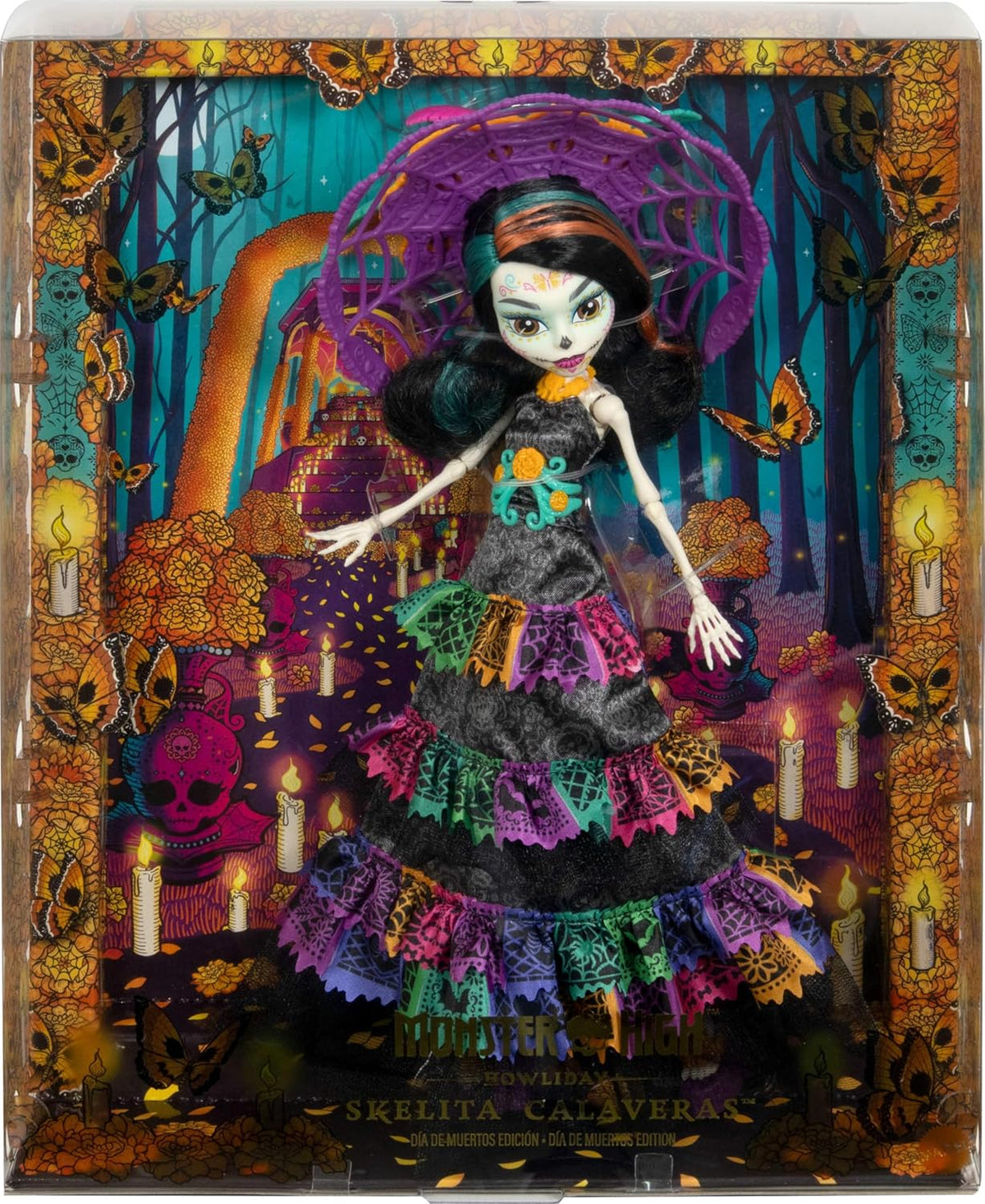 Świętuj Día de Muertos z kolekcjonerską lalką Skelita Calaveras w uroczej świątecznej sukience.