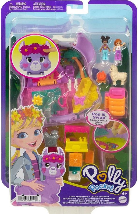 Przygotuj się na niezapomniane biwakowanie z Polly Pocket™ Camp Adventure™ Llama Compact! Ta urocza kompaktowa zabawka w kształcie lamy z różowym wianuszkiem i przyjemną w dotyku powierzchnią zapewnia niekończącą się zabawę. Otwórz ją i odkryj dwie mikro laleczki, pięć ruchomych funkcji oraz 13 akcesoriów, z których niektóre mają funkcję Pop and Swap™. Rozstaw obóz, upiecz s'mores z przyjaciółmi lub zatańcz na scenie — dzieci mogą zbierać wszystkie kompaktowe zestawy Pocket World i rozszerzać zabawę! Idealne dla dzieci od 4 lat wzwyż. Każda zabawka sprzedawana osobno, w zależności od dostępności. Kolory i dekoracje mogą się różnić.