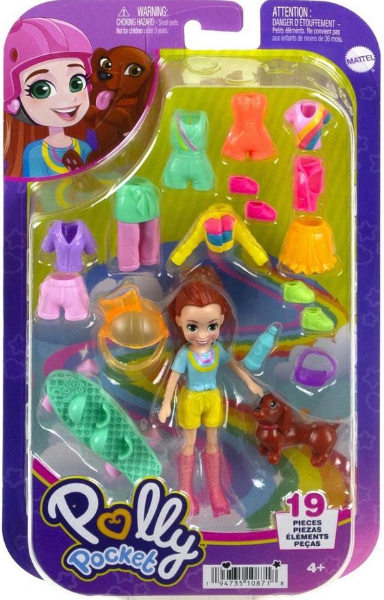 Mattel Polly Pocket - Lalka z zestawem sportowym do jazdy na deskorolce z pupilem (HKV90)