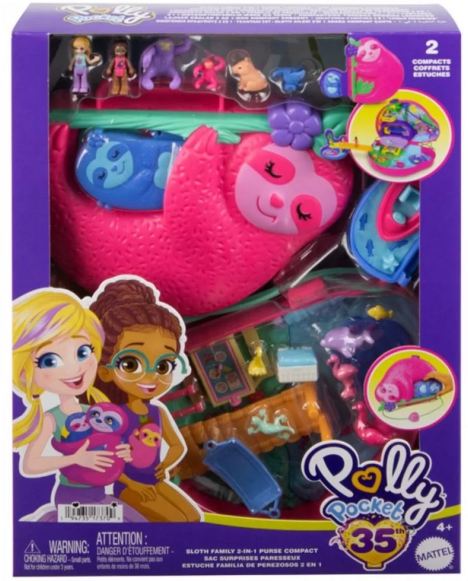 Baw się z Polly Pocket™ w tej uroczej kompaktowej torebce Sloth Family 2-w-1! Zewnętrzna część torebki jest zaprojektowana jak mama leniwiec z młodym leniwcem przypiętym do jej brzucha! Zarówno mama, jak i młody leniwiec otwierają się, odsłaniając tropikalny zestaw do zabawy o tematyce dżungli z 2 mikro-lalkami i 12 akcesoriami (w tym 8 zwierzątkami domowymi)! Oba kompaktowe zestawy łączą się mostkiem, tworząc idealne doświadczenie 2-w-1. Przejedź się na tyrolce z przyjacielem tukaniem w części kompaktu mamy leniwca lub otwórz namiot leniwca, aby odkryć wygodną huśtawkę. Ciesz się basenem wodnym i zakręć się pod wodospadem! Następnie przejdź mostkiem do kompaktu młodego leniwca i znajdź ukrytą plażę, aby zbierać banany lub wybierz się na przejażdżkę łodzią! Gdy nadejdzie czas na wyjście, połącz oba kompaktowe zestawy i użyj paska torebki, aby bawić się gdziekolwiek i kiedykolwiek! Doskonały prezent dla dzieci od 4 lat, szczególnie dla tych, które kochają zwierzęta!