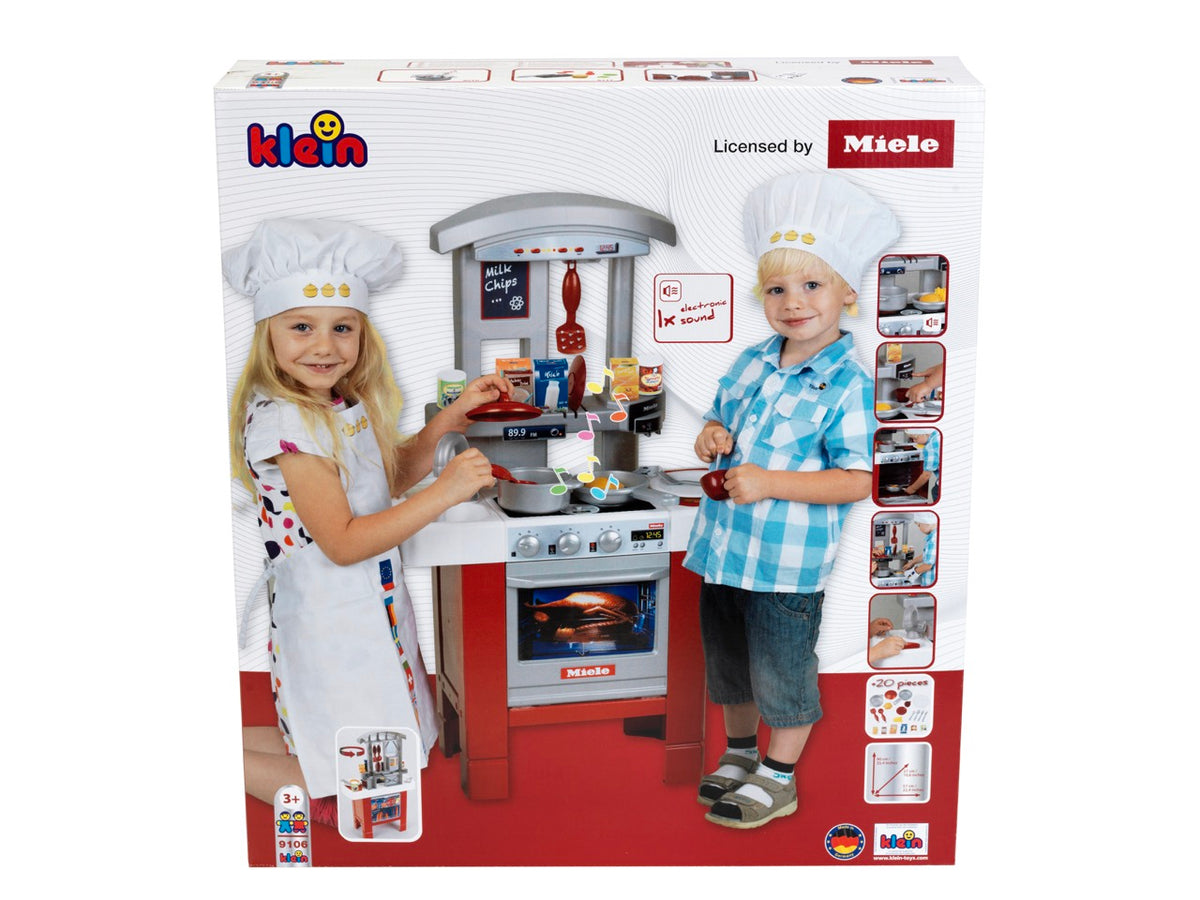 Kuchnia Starter Miele ma wysokość 90 centymetrów i szerokość 57 centymetrów. Pomimo kompaktowych rozmiarów oferuje młodym amatorskim kucharzom wszystko, czego dusza zapragnie: płytę grzewczą, która nie tylko wydaje dźwięki gotowania, ale także piekarnik, z którego mogą wyczarować zwodniczo realistycznie wyglądającego pieczonego kurczaka i frytki. Również kran i zmywarka, radio oraz ekspres do kawy są częścią wyposażenia tego oszczędzającego miejsce urządzenia! To pozwala małym profesjonalnym kucharzom rozpieszczać swoich gości pod każdym względem i, dzięki dołączonym akcesoriom, wszystko pięknie aranżować i podawać.