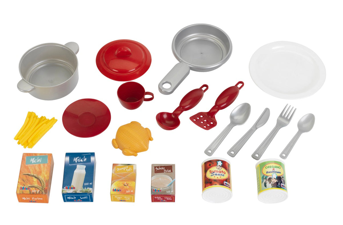 Miele kuchnia 'starter' Dziecięca kuchnia do zabawy w stylu Miele, którą można bawić się z obu stron, zachwyca małych miłośników gotowania modułem dźwiękowym z elektronicznymi odgłosami gotowania, wieloma możliwościami zabawy oraz dużą ilością akcesoriów. Zawiera piekarnik, zmywarkę, okap, zlew oraz praktyczną przestrzeń do przechowywania. Dołączona jest również patelnia, garnek z pokrywką oraz wyposażenie kuchenne (łopatka, drewniana łyżka). W zestawie znajduje się także zastawa stołowa, taka jak talerze, widelce, noże, łyżki, filiżanka do espresso, podstawka i łyżeczka do kawy. Aby mali kucharze mogli coś przygotować w wyobraźni, dołączone są również repliki jedzenia: frytki, połówka kurczaka oraz cztery opakowania jedzenia i dwie puszki.