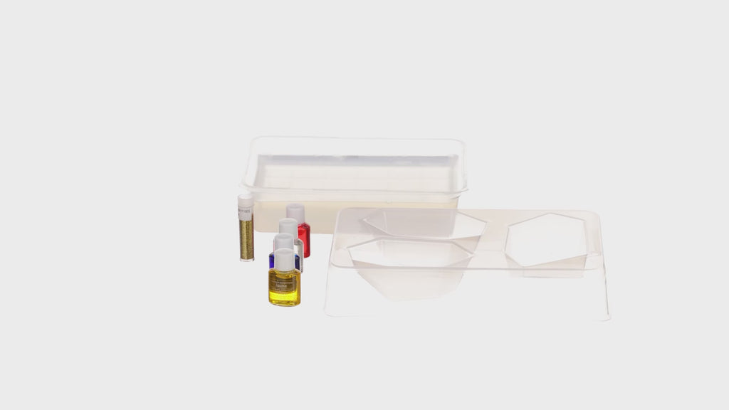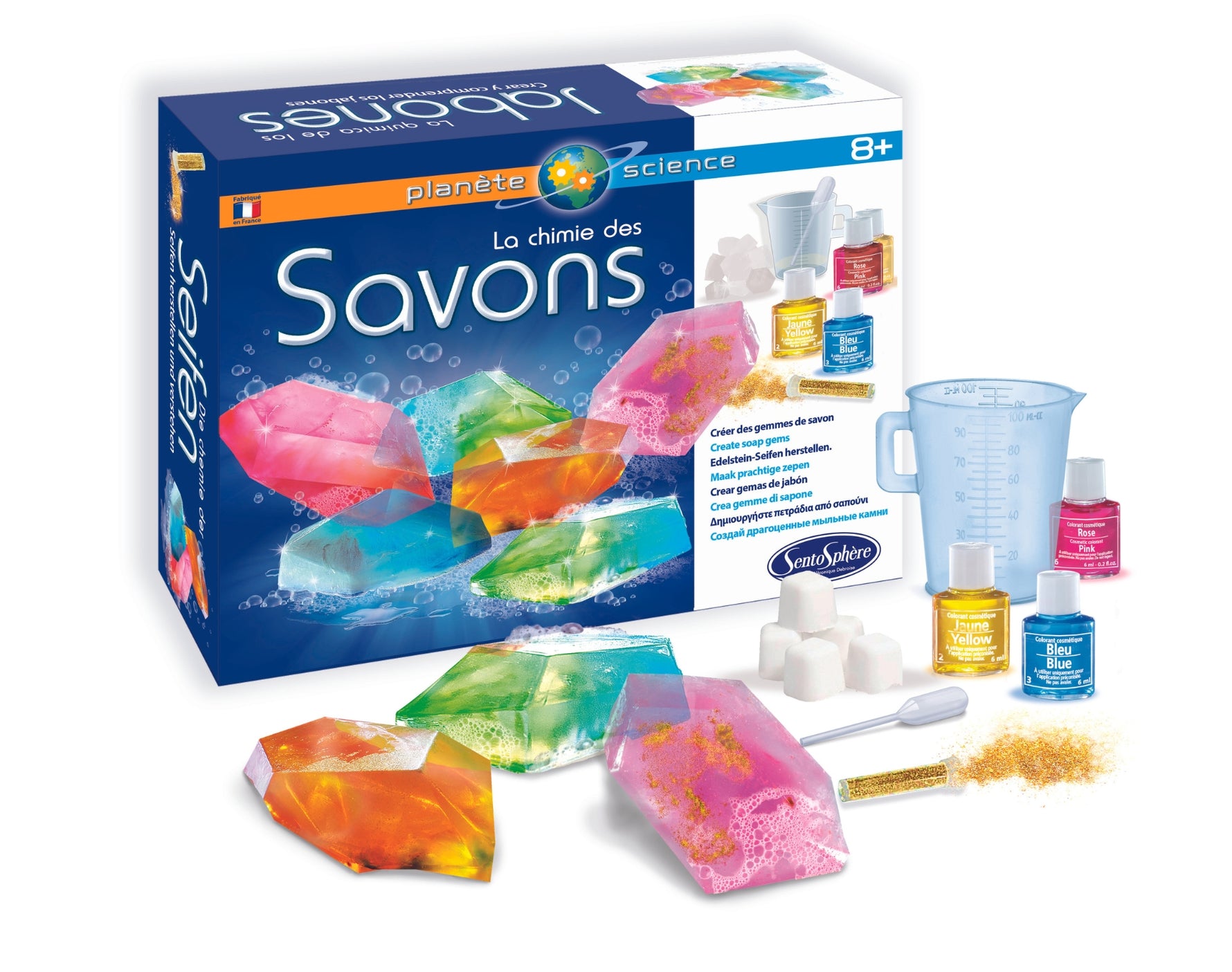 Opremljeni s pipetami, barvili in zlatim bleščicami, bodo mladi kemiki lahko obarvali tekoče milo, ki so ga vlili v kalupe v obliki kamnin! Ko se ohladijo, bodo iz kalupov vzeli čudovite milne oblike draguljev. Z njihovim največjim zadovoljstvom se lahko ti milni izdelki z videzom smaragda, turkiza ali opala uporabljajo za umivanje rok! Ta komplet vsebuje znanstvena navodila, ki pojasnjujejo izvor mila in osnovna načela saponifikacije.